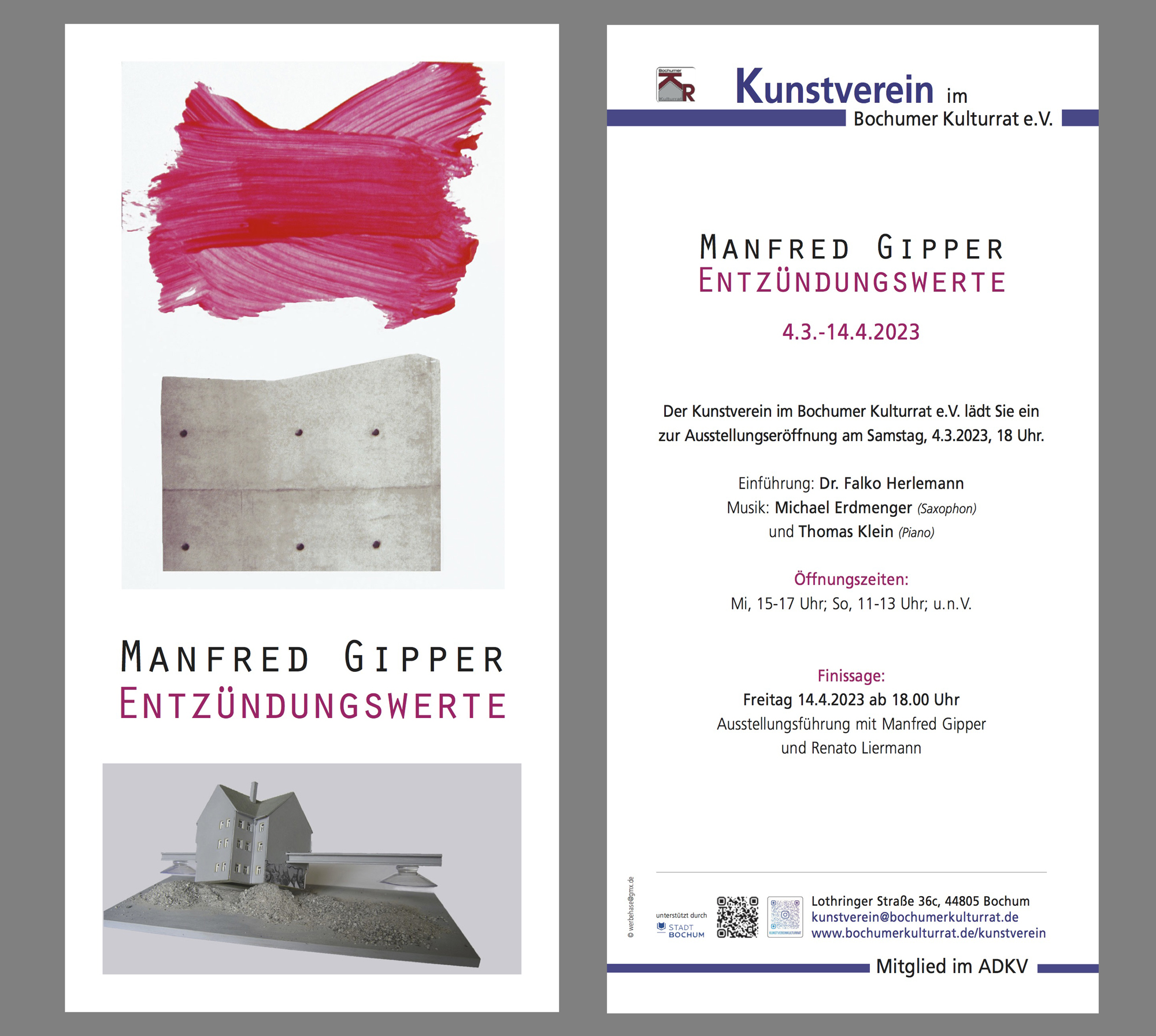 4. März bis 14. April 2023: Ausstellung ENTZÜNDUNGSWERTE im Kunstverein im Bochumer Kulturrat e.V., Lothringer Str. 36c. Den Flyer können Sie hier als PDF herunterladen. |