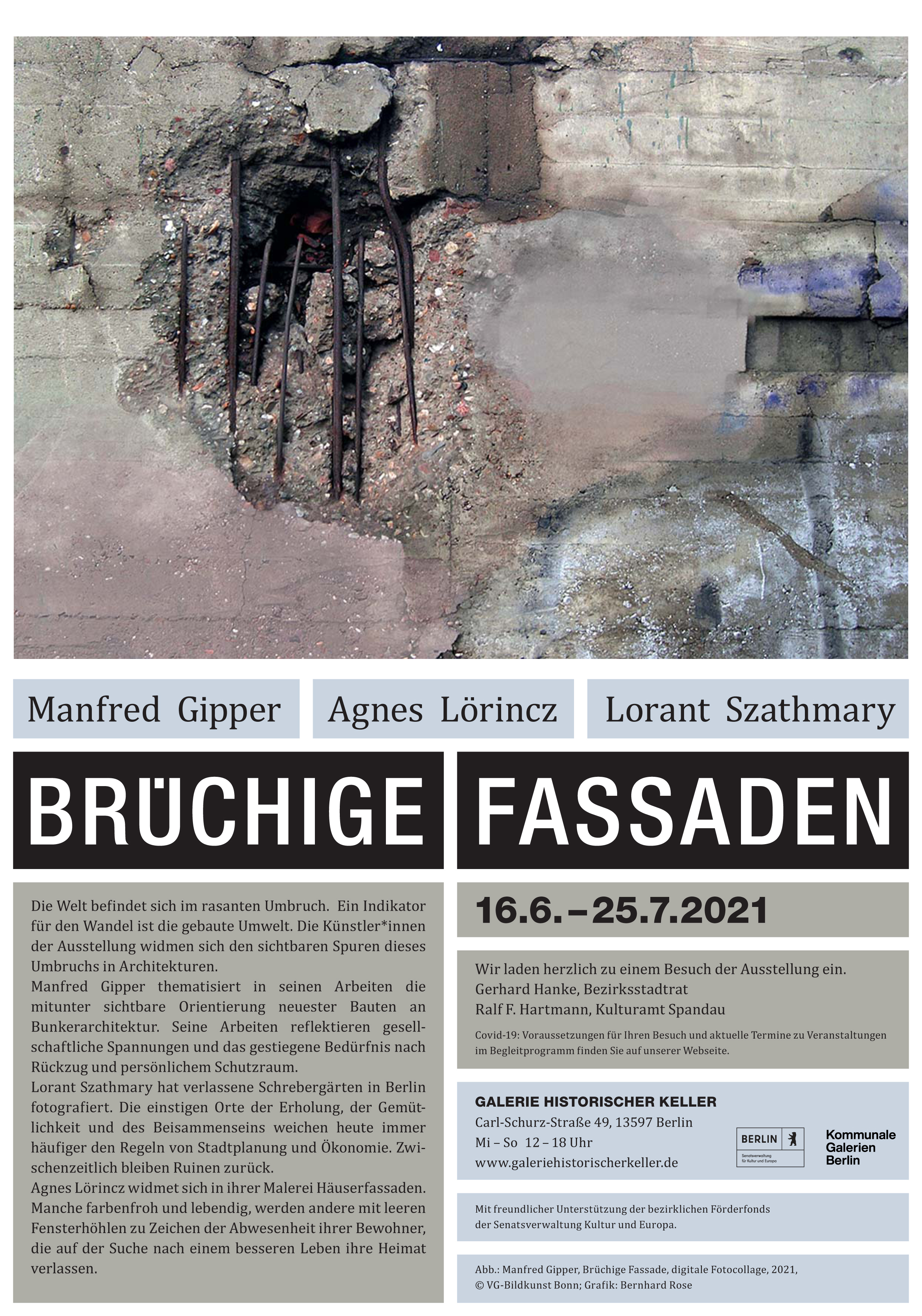 16. Juni bis 25. Juli 2021: Gruppenausstellung BRÜCHIGE FASSADEN in Berlin-Spandau, zusammen mit Agnes Lörincz und Lorant Szathmary. Galerie Historischer Keller, Carl-Schurz-Straße 49, 13597 Berlin, Mi - So 12-18 Uhr. Den Flyer können Sie hier als PDF herunterladen. |