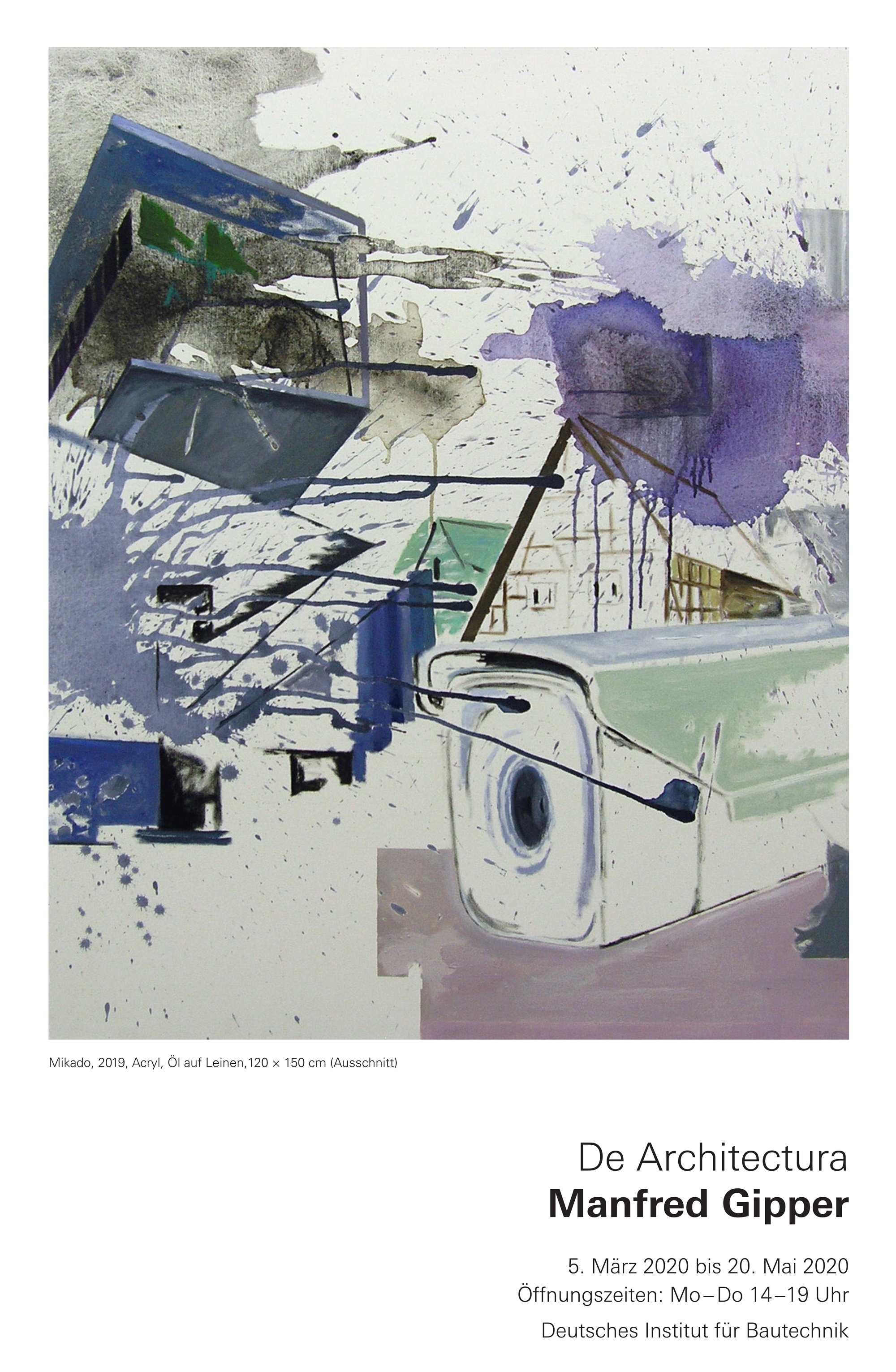 4. März bis 20. Mai 2020: Einzelausstellung DE ARCHITECTURA. Eröffnung am Mittwoch, 4. März 2020, 17.00 - 19.30 Uhr. Die Ausstellung geht bis zum 20. Mai 2020. Deutsches Institut für Bautechnik, Kolonnenstraße 30 B, 10829 Berlin. Das Plakat können Sie hier als PDF herunterladen. |