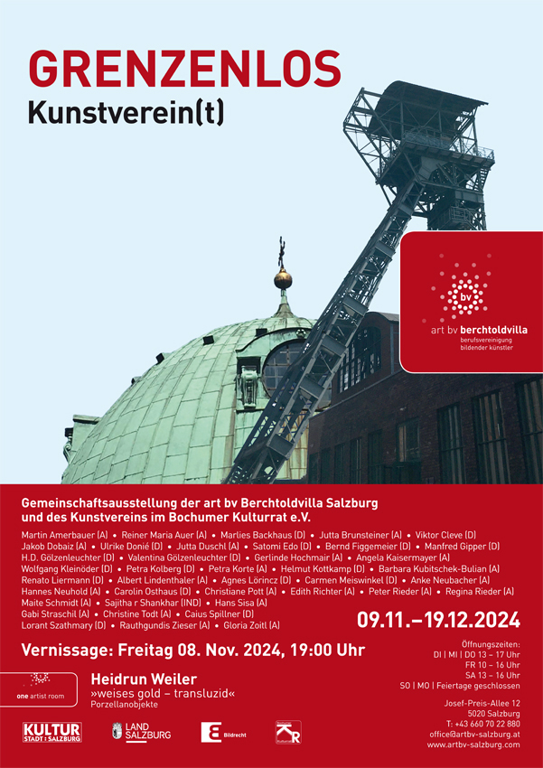 9. November bis 19. Dezember 2024: Die Austausch-Ausstellung zu Grenzenlos-Kunstvereint findet in der Salzburger Berchtoldvilla statt. Vernissage: 8.11.2024 um 19 Uhr. Den Flyer (PDF) dazu können Sie hier herunterladen. |
