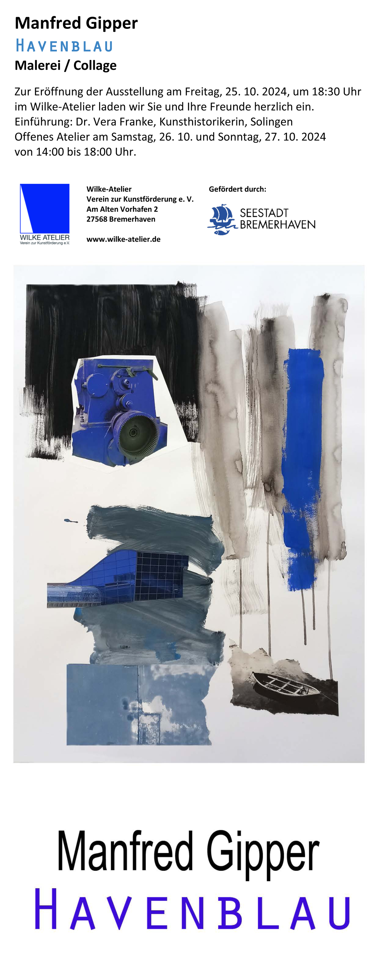 Oktober 2024: Aufenthaltsstipendium im Wilke-Atelier in Bremerhaven. Auf der Presse-Seite gibt es dazu ein Portrait von Anne Stürzer aus der Nordseezeitung. Eröffnung der Ausstellung HAVENBLAU am Freitag, 25. 10. 2024, im Wilke-Atelier. Einführung: Dr. Vera Franke, Kunsthistorikerin, Solingen Offenes Atelier am Samstag, 26.10. und Sonntag, 27.10.2024. Den Flyer dazu (PDF) können Sie hier herunterladen. - Siehe auch die neuen Collagen der Serie Havenblau!