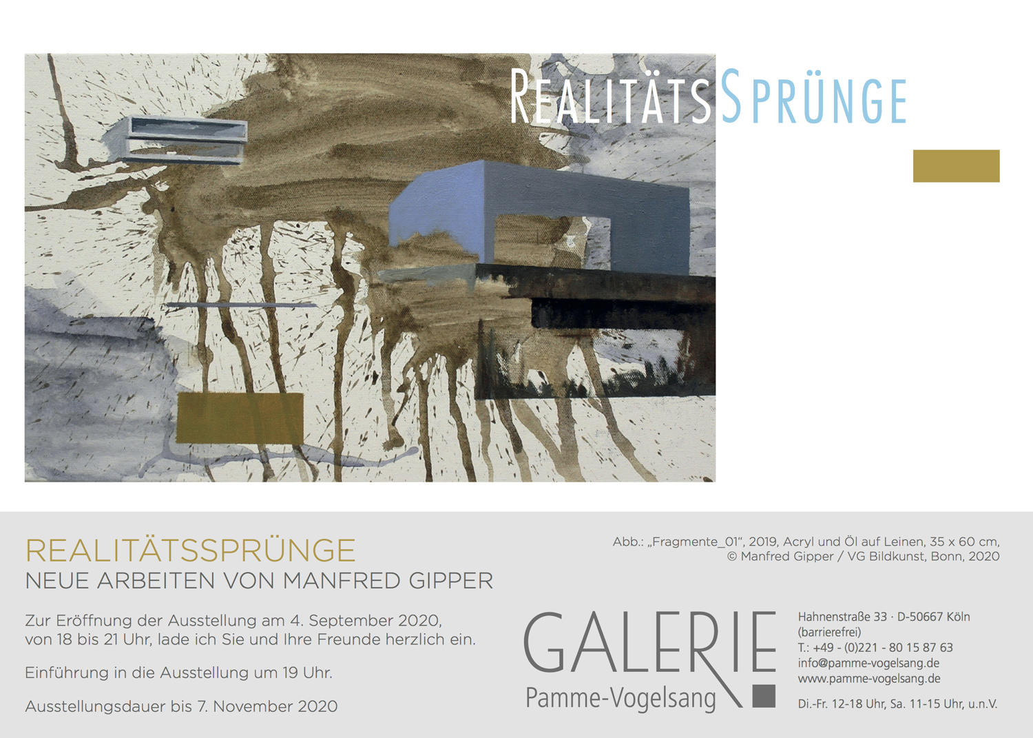 4. September bis 7. November 2020: Einzelausstellung REALITÄTSSPRÜNGE. Eröffnung am 4. September 2020, 18 bis 21 Uhr, Einführung um 19 Uhr. Galerie Pamme-Vogelsang, Hahnenstraße 33, 50667 Köln (barrierefrei). Öffnungszeiten: Di.-Fr. 12-18 Uhr, Sa. 11-15 Uhr und nach Vereinbarung. Die Einladungskarte können Sie hier als PDF herunterladen. |