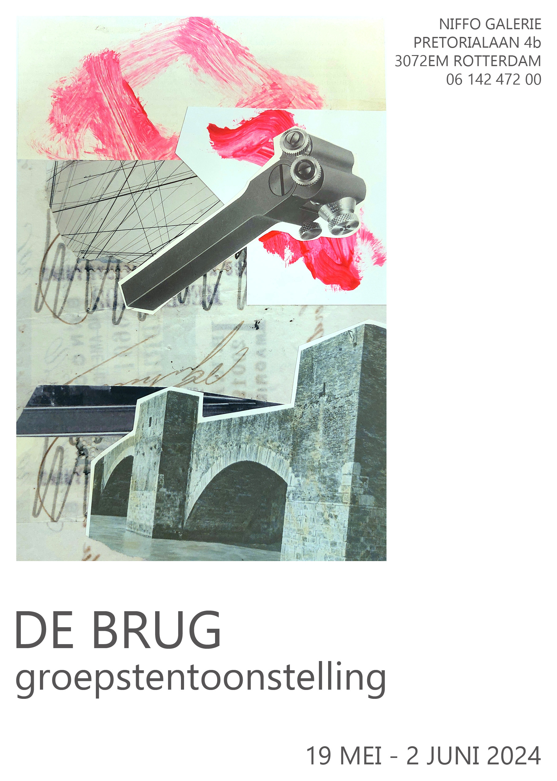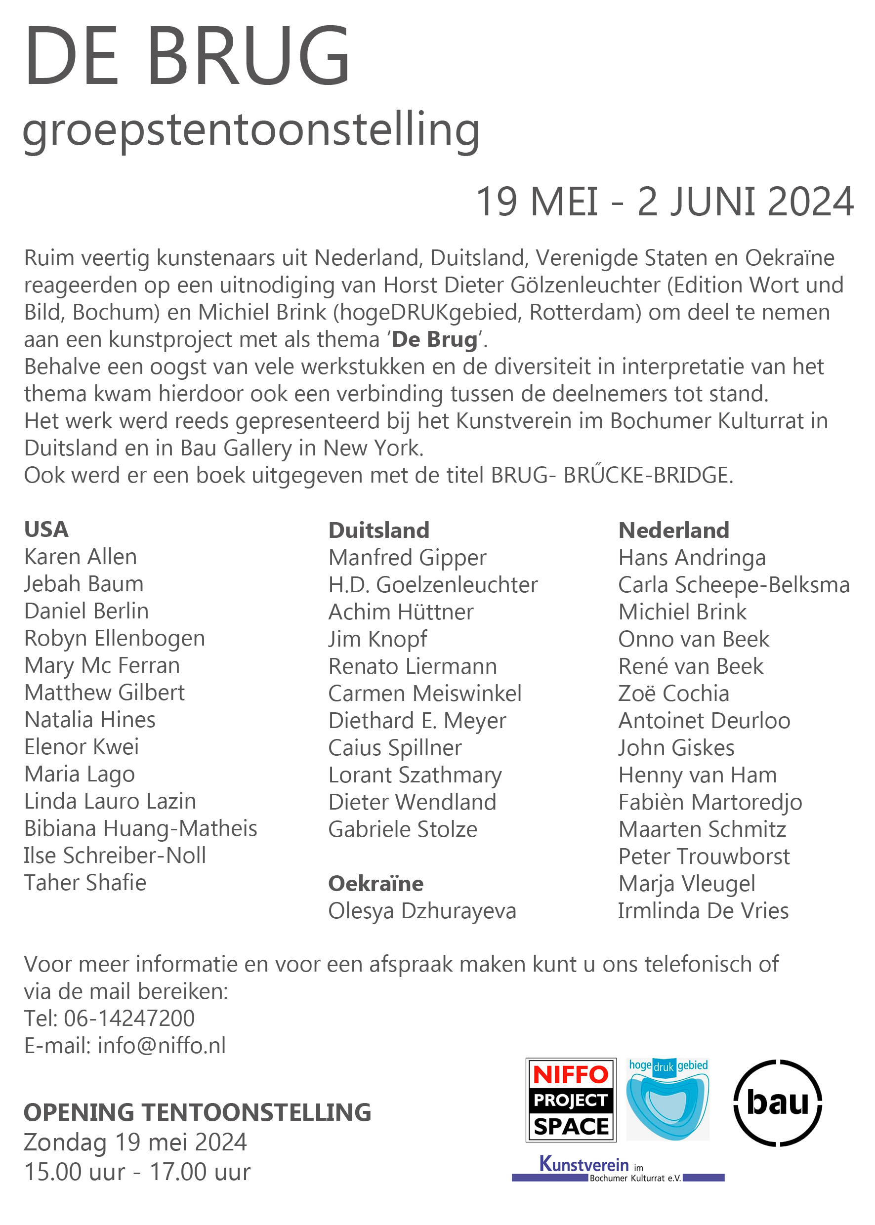 19. Mai bis 2. Juni 2024: Ausstellung bei DE BRUG - Bridge-Brücke-Brug 2024 in der Galerie NIFFO in Rotterdam/NL, Pretorialaan 4b. Die Ausstellung wird organisiert als Kooperation der BAU Gallery in Beacon/New York State, der Stiftung hogeDRUKgebied Rotterdam und des Kunstvereins im Bochumer Kulturrat und war Anfang 2024 bereits im Kunstverein im Bochumer Kulturrat zu sehen. |