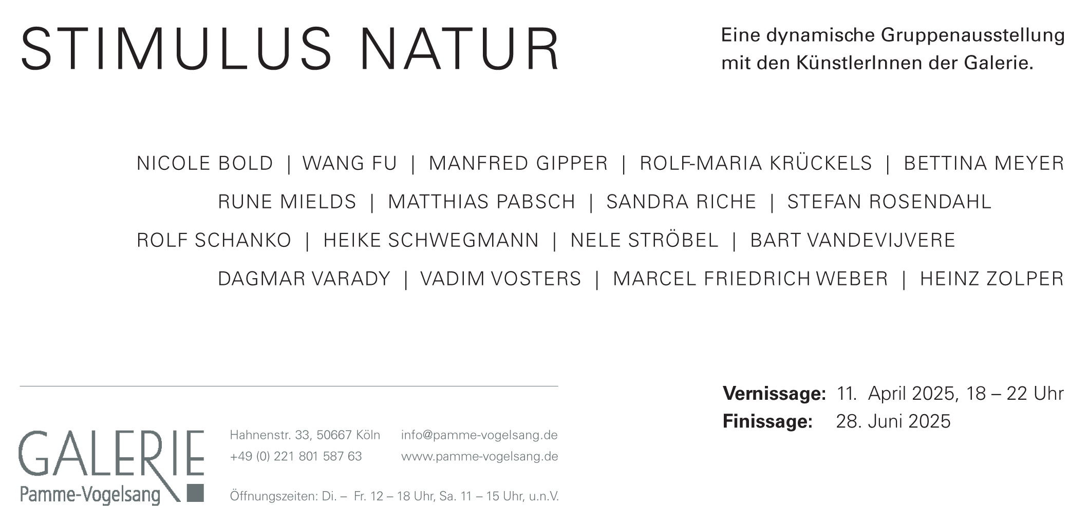 11. April bis 28. Juni 2025: Gruppenausstellung in Köln: STIMULUS NATUR in der Galerie Pamme-Vogelsang Vernissage am 11. April, 18 Uhr. Dr. Gudrun Pamme-Vogelsang über die Ausstellung: Den Flyer (PDF) dazu können Sie hier herunterladen. |