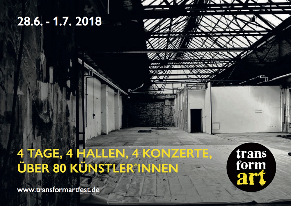 28. Juni 2018: Eröffnung der Transformart in Berlin-Schöneweide, ich bin dort vertreten als einer von über achtzig internationalen Künstlern. "Zeitgenössische Kunst und Musik vor industriehistorischer Kulisse". Den Flyer dazu können Sie hier herunterladen (PDF). |